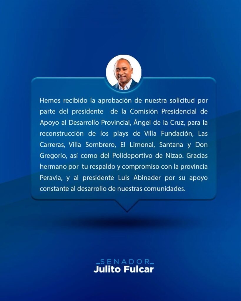 “Hemos recibido la aprobación de nuestra solicitud para la reconstrucción de los plays de Villa Fundación, Las Carreras, Villa Sombrero, El Limonal, Santana y Don Gregorio, así como del Polideportivo de Nizao. Agradecemos el respaldo del compañero Ángel de la Cruz y el apoyo constante del presidente Luis Abinader al desarrollo de nuestras comunidades”, expresó el legislador.