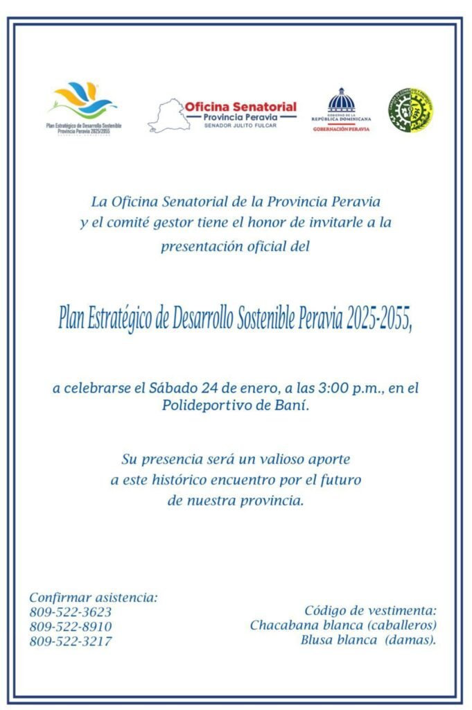 Será presentado el próximo sábado 24 de enero, el Plan de Desarrollo Sostenible de la Provincia Peravia 2025-2055, elaborado tras 17 meses de consultas con la comunidad y las instituciones de la localidad, por convocatoria de la Oficina Senatorial, asesoradas por un comité de investigación y movilización social.